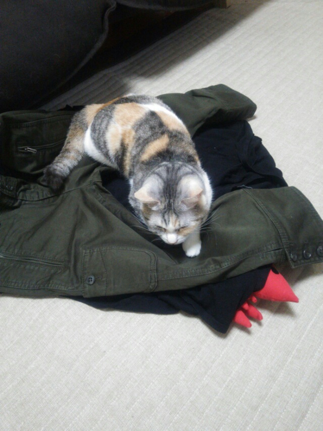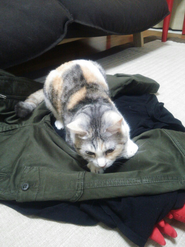 しまみけが、アイロンかけたばっかりの服の上に…。