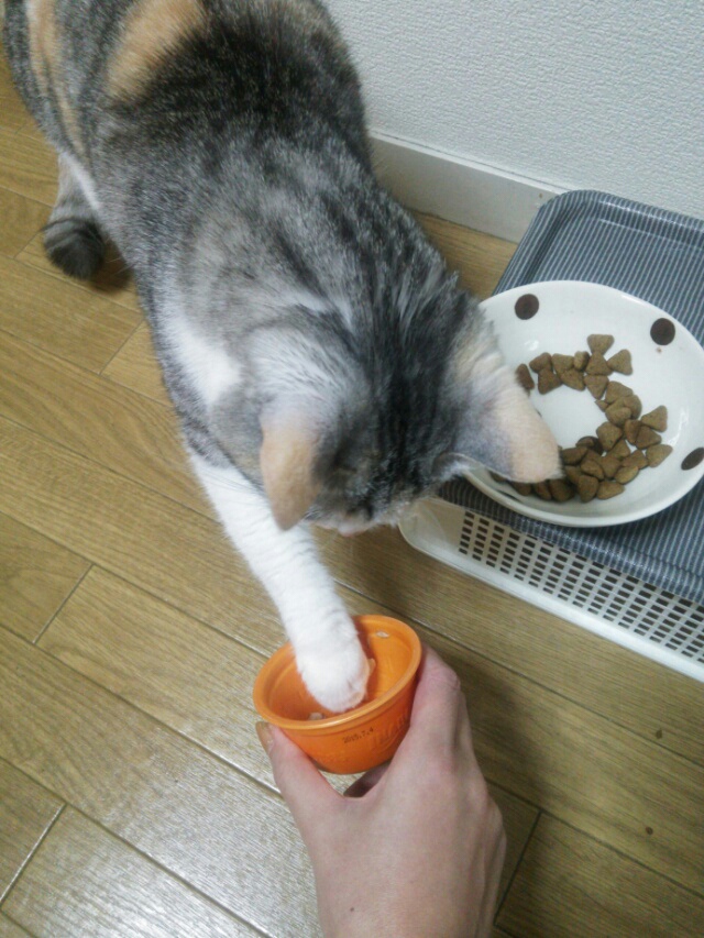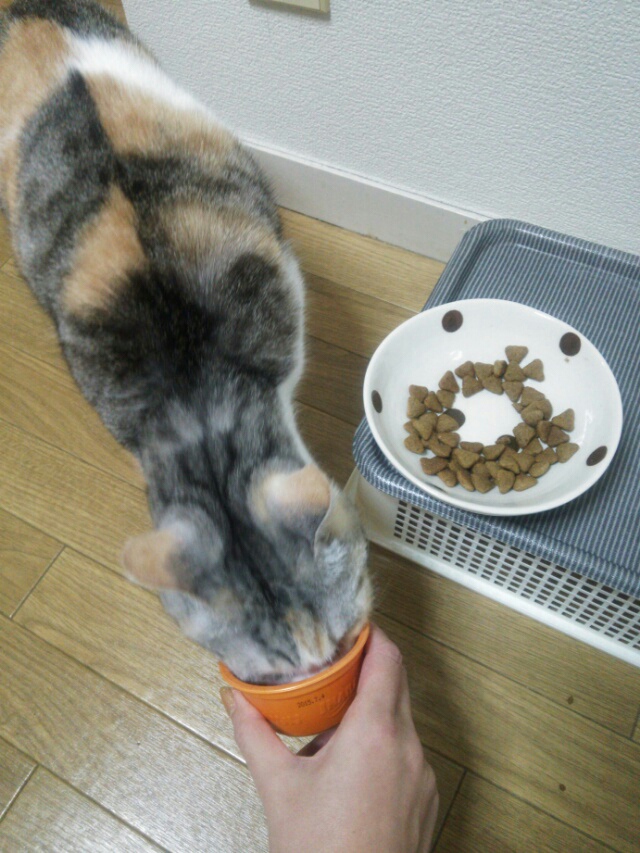 それも頑張って頭をカップに突っ込んで食べようとするしまみけ。