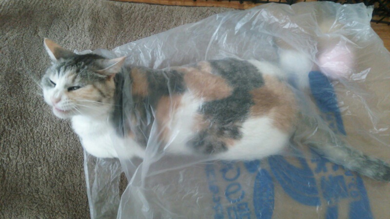 クリーニングの袋が相変わらずお気に入りのしまみけ。