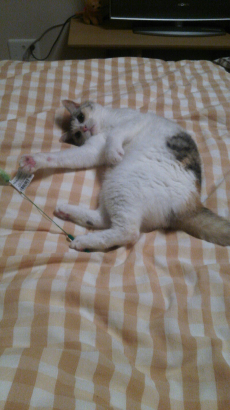 ベッドの上で可愛く転がるしまみけ。