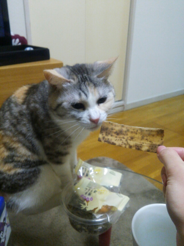 ちなみに、ケンタッキーのチキンを家で食べようとして食卓に置いてたら、普段は(人前では)乗らない食卓に控えめに登ってきました。