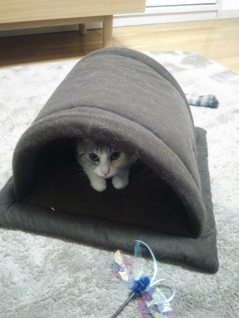 だいぶ前にトンネル型ベッドにしまみけが(オモチャ目的で)入ったと書きましたが、ここ数日、普通に中で寛ぐようになりました。