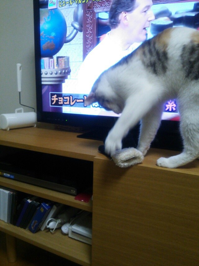 使った手袋をエアコンが当たる位置に置いて乾かそうとしたら、しまみけに獲物扱いされました。
