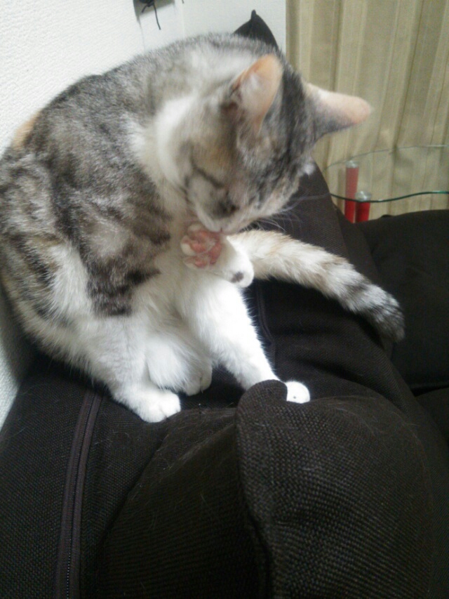 一心不乱に肉球をうまうまするしまみけ。