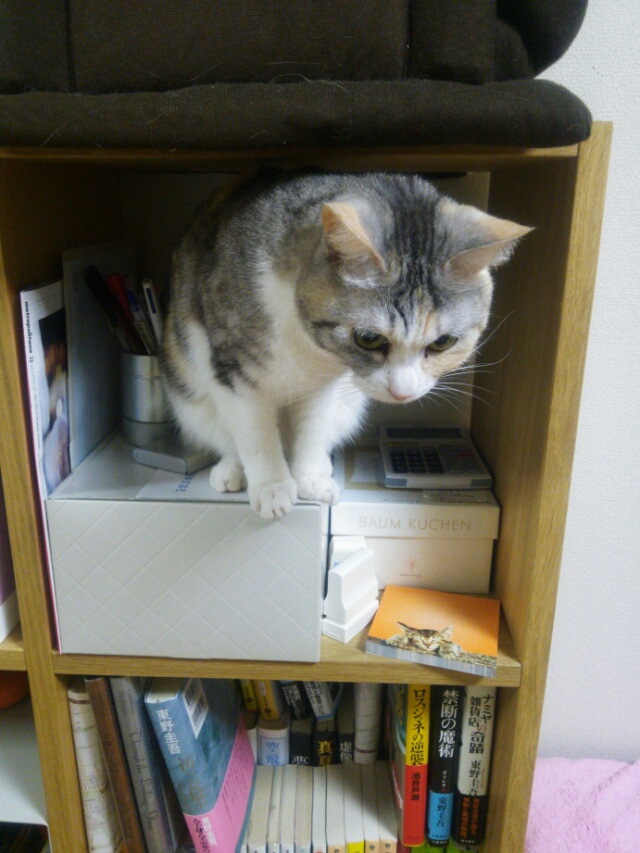 その棚にしまみけが入り込みました。