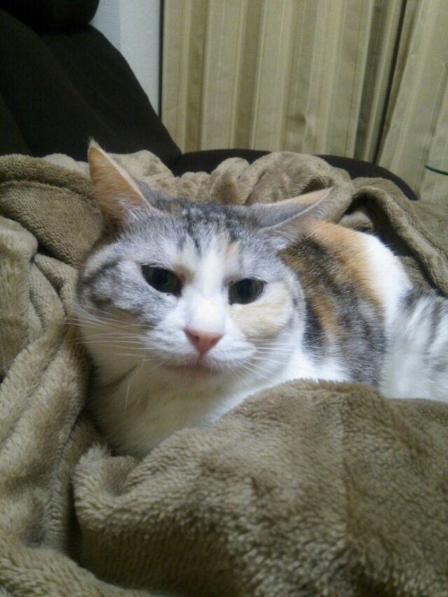 毛布に包まれてご満悦のしまみけ。