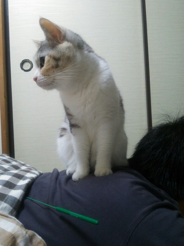 背中とお布団の間におもちゃを隠したら、しまみけが登ってきました。