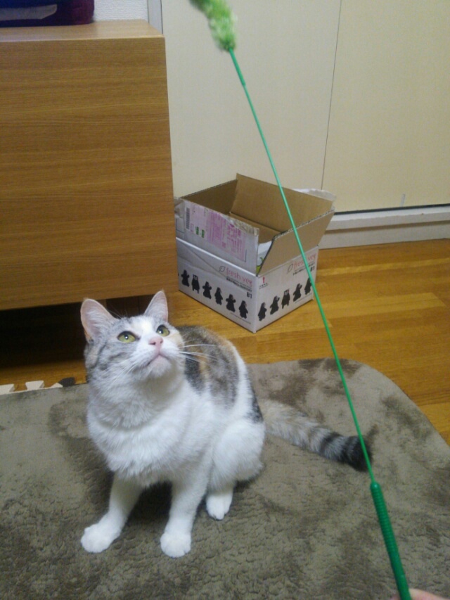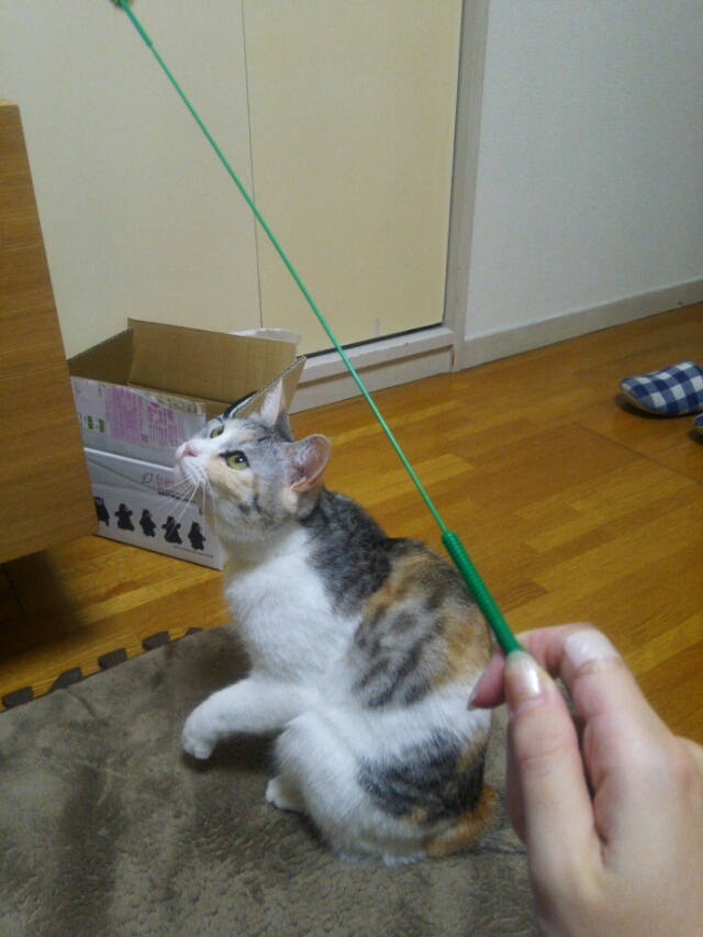 しまみけは興味津々、じゃらすほうは引っ掛かれる心配なし。
