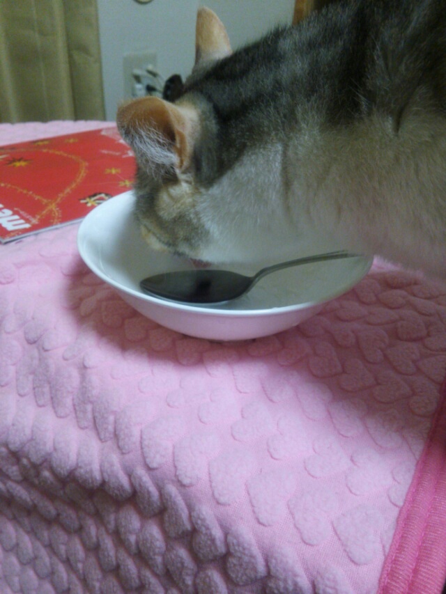 ヨーグルトを食べてそのままお皿を放置してたら、しまみけがお皿を舐めていました。