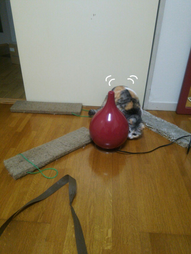 加湿器の向こう側から隠れながら紐を狙うしまみけ。