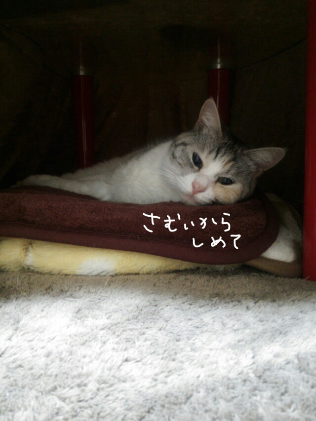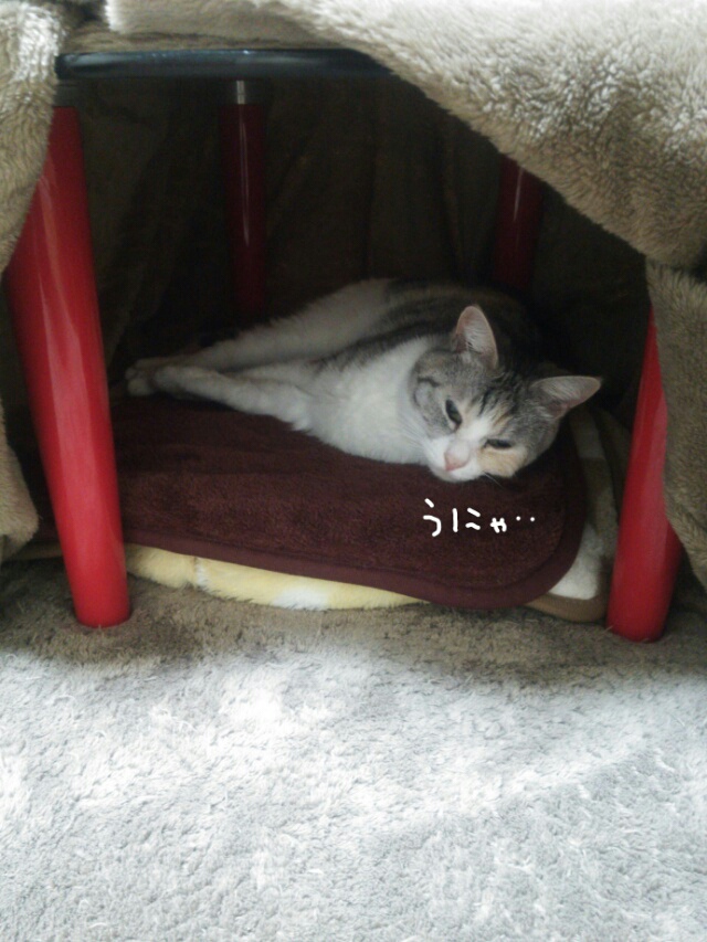 にゃんこ用ブランケットでは丈が足りなくてすきまがあって寒いので、人間用のブランケットに変えました。