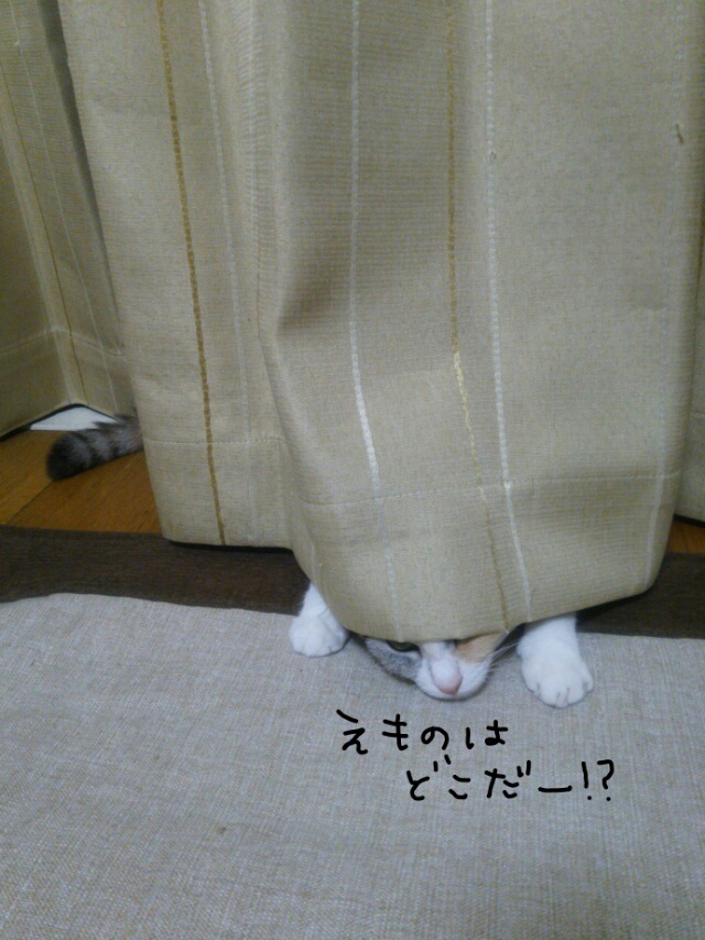 しまみけがカーテンの向こうから獲物(おもちゃ)を狙っています。