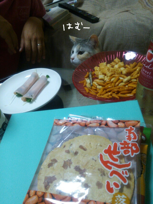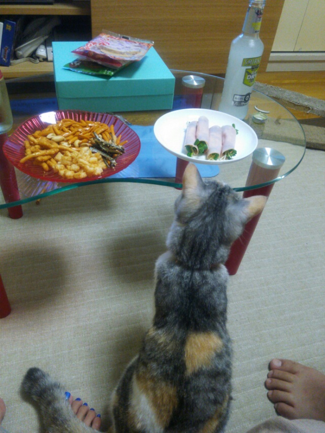 夜は夫婦で酒盛り~と準備をしたら、しまみけがやって来ました。