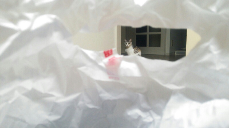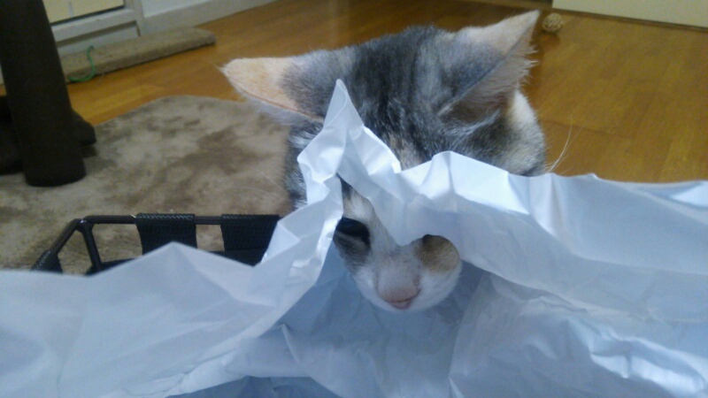 ごみ袋の持ち手の穴に顔を突っ込んでます。