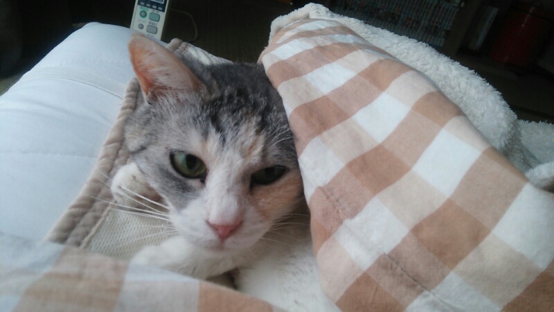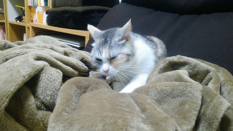 渋い顔をしていますが、ぶるぶる言いながらご機嫌で毛布をもみもみするしまみけ。