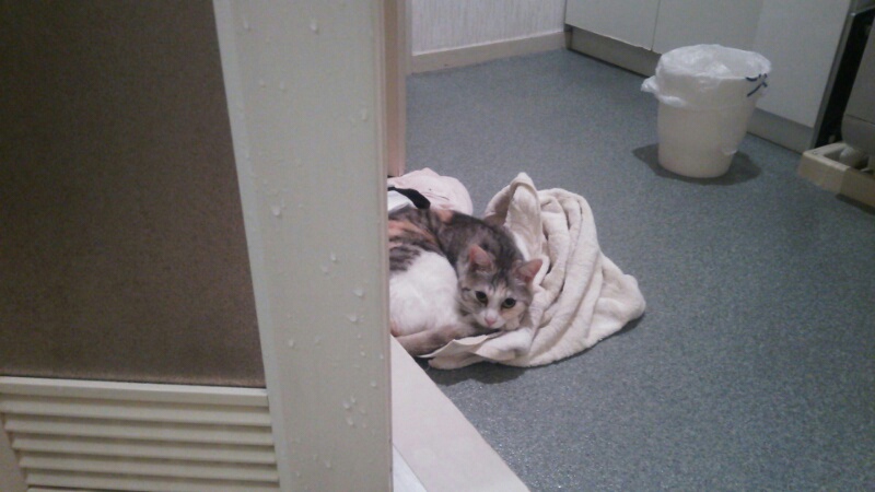 熱くてドアを開けてお風呂に入っていたんですが、ふと見るとしまみけがタオルの上に鎮座。