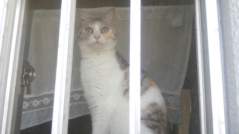 お出掛け前に窓からしまみけに声を掛けたら、窓辺にやって来ました。