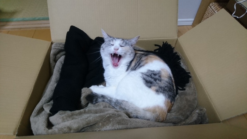 段ボールが手に入ったので、毛布を敷き詰めたらしまみけがいそいそと使ってました。