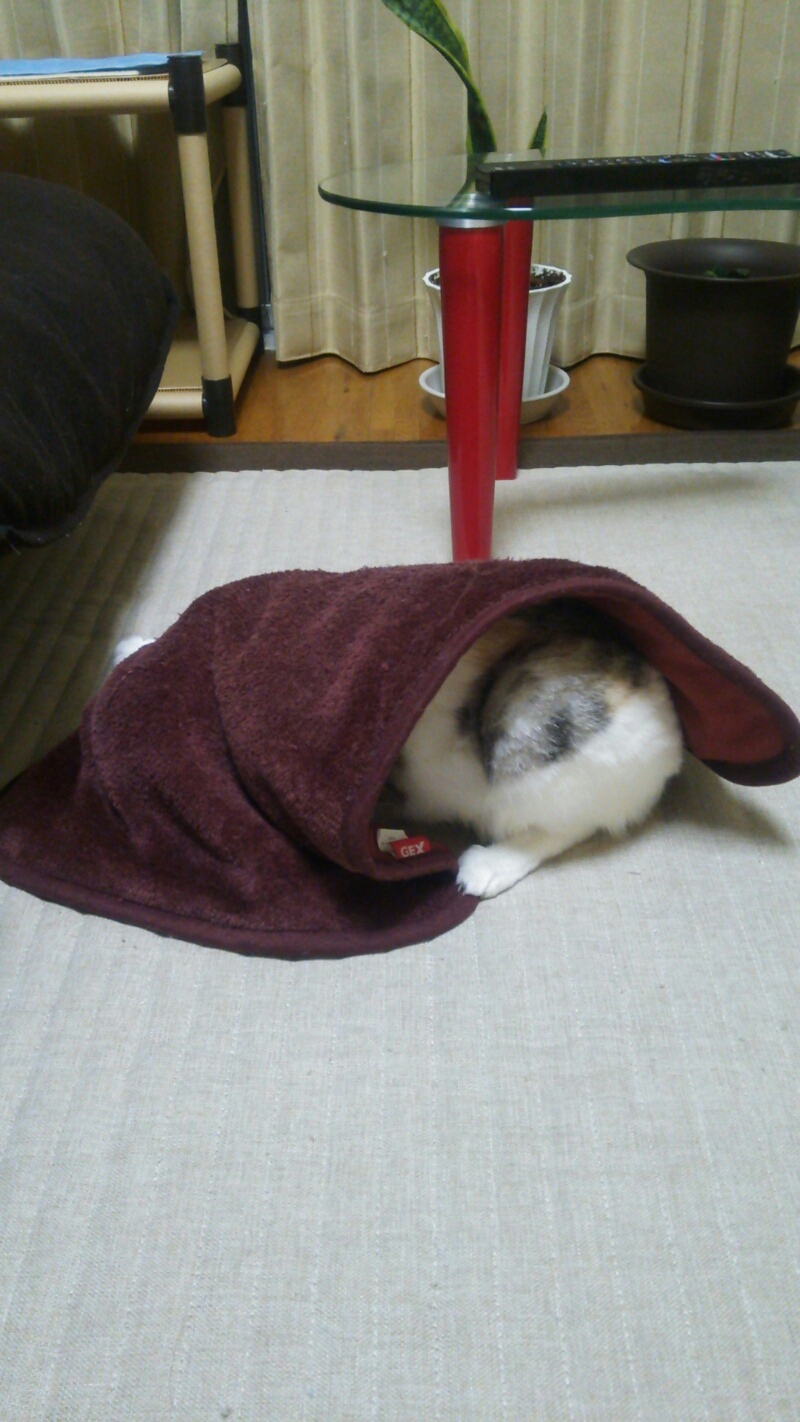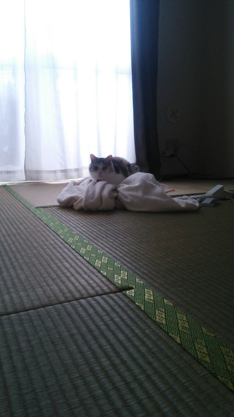 不思議なことに、きちんと畳んでるタオルケットには乗りません。