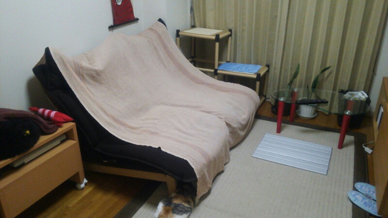 暑いので、体がソファーに直接触れないようにソファーに布をかけました。
