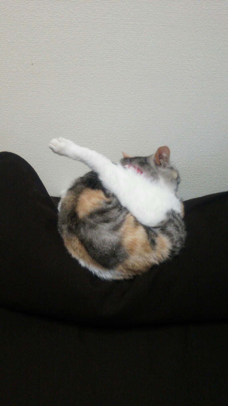 相変わらずソファーのヘッドレストでくつろぐしまみけ。