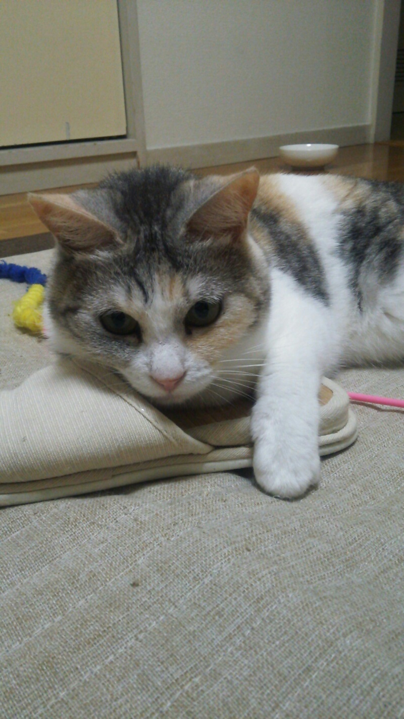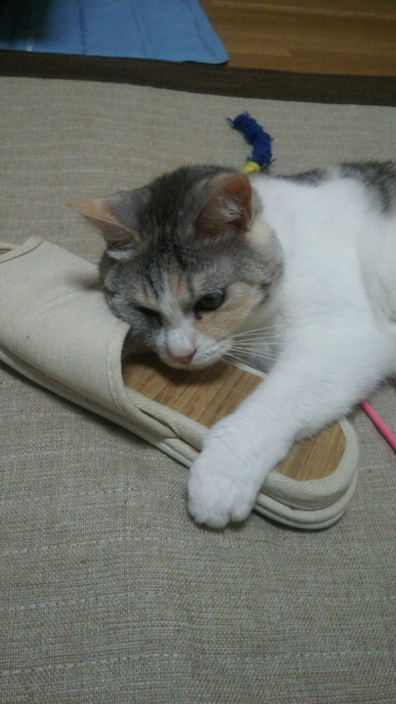 このすりっぱはしまみけのものにゃ!と言わんばかりにホールドしてます。