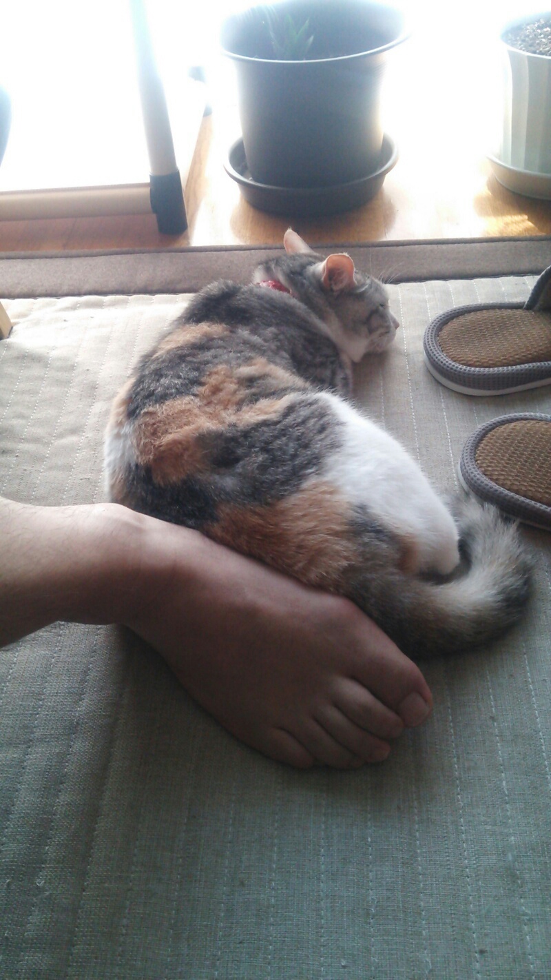 しまみけは主人の(足の裏の)温もりを堪能し、主人はしまみけのもふもふを(足の裏で)堪能し、お互い満足しているようです。