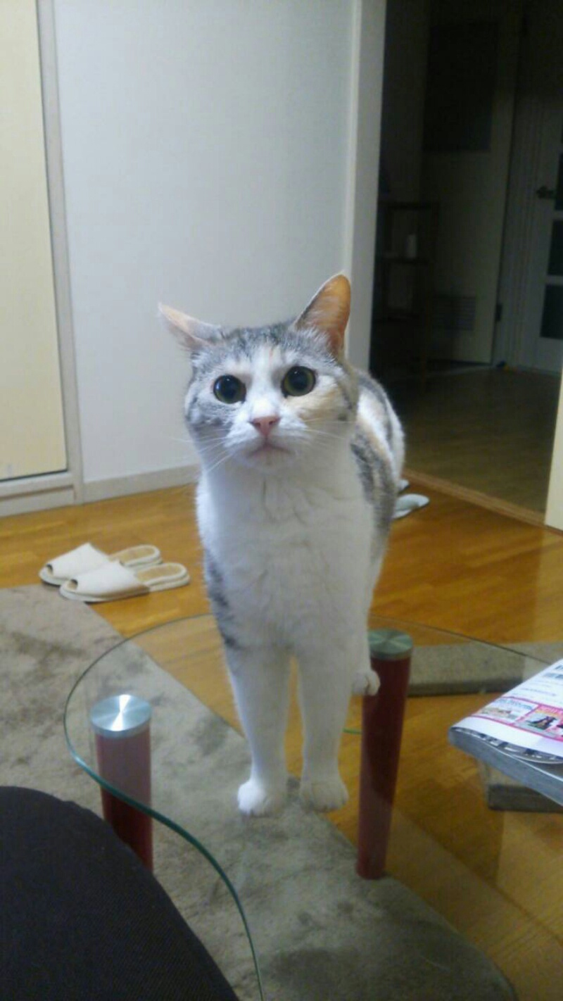 ダイニングのテーブルはしまみけお登り禁止ですが、一昨日、振り向いたら当たり前のように登ってこっちに甘えてきました。