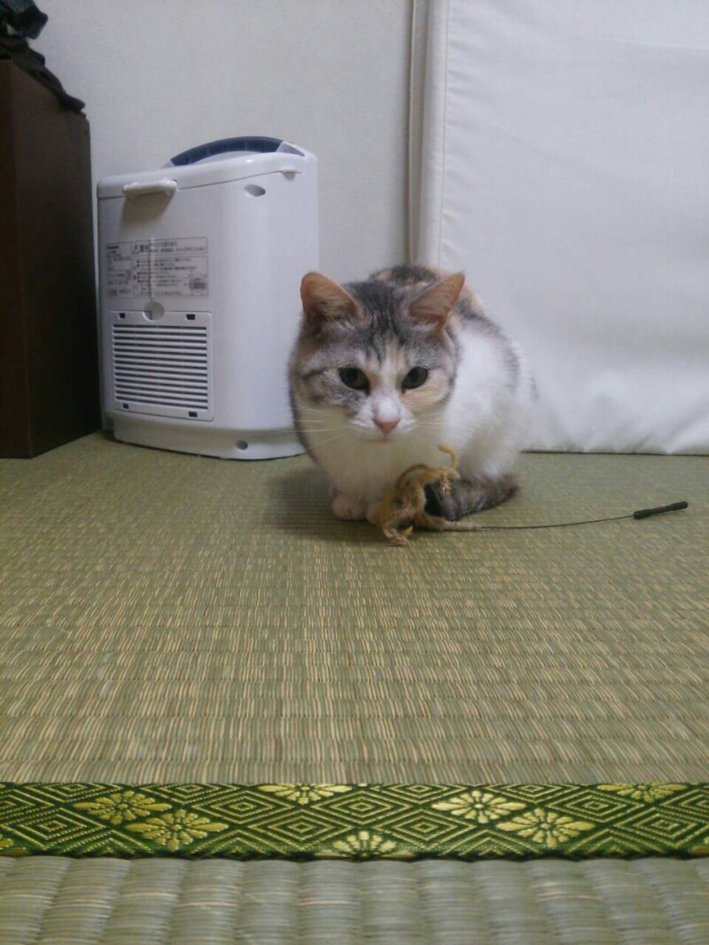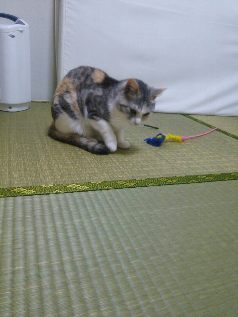 少し「みゃっ」と鳴いたかと思うと、また暗闇でおもちゃをくわえてカタカタと歩き回る音が…。