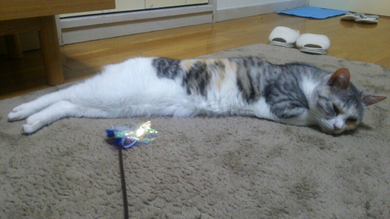 さっきまでリビングで爆睡してたのに、電話の声で「おかーさんおきたにゃ!」って思ったんだろうなぁ。