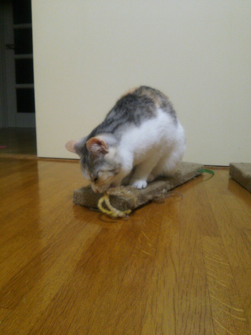 吊るしてあったニットカーデにじゃれついて、穴を開けて現行犯で叱られたしまみけ。