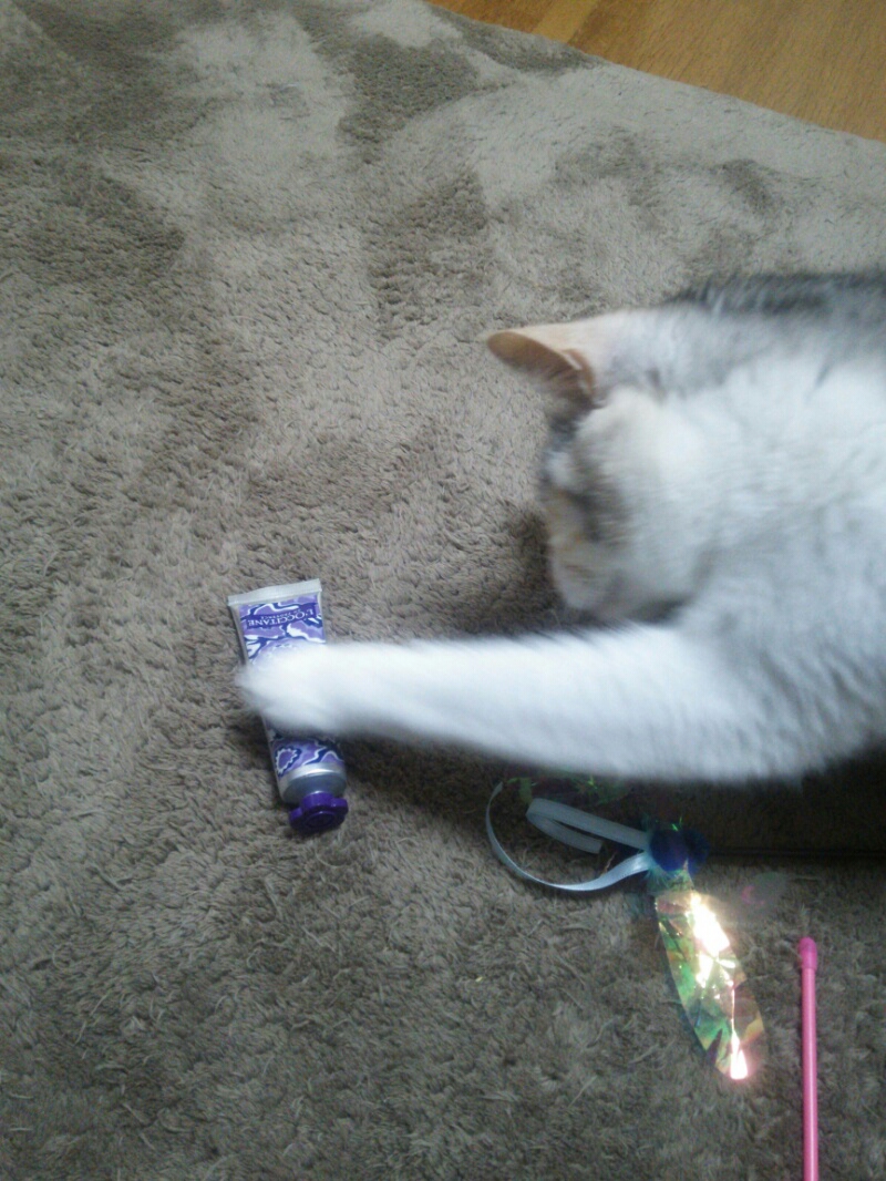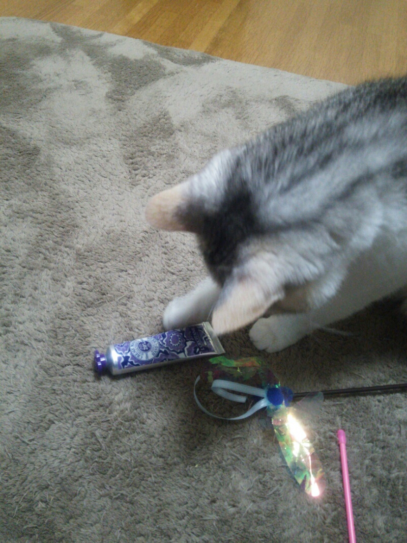 後で使おうとハンドクリームを置いておいたらおもちゃにされました。