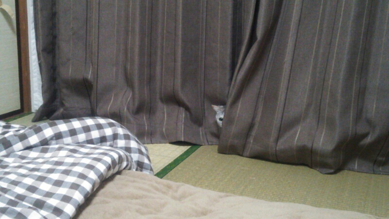 カーテンからしまみけがちらり。