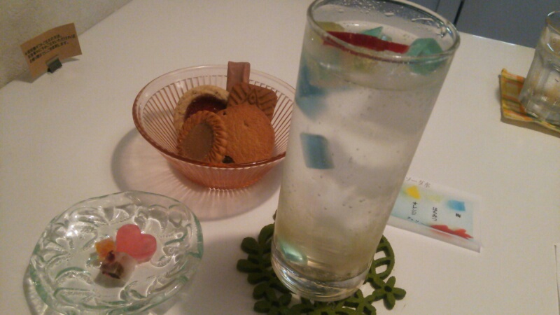 琥珀糖を浮かべた「鉱石ソーダ」とクッキーをいただきました。