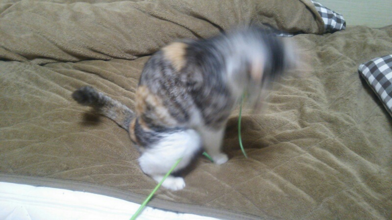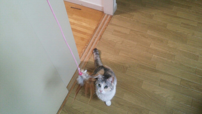 大分前に買って、しまみけの反応がイマイチだった羽のおもちゃをもう一度出してみました。
