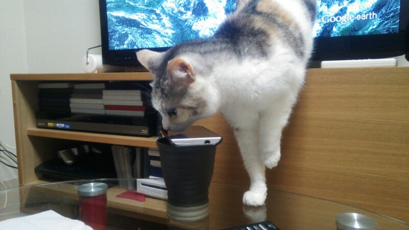 主人の牛乳を狙ってました。
