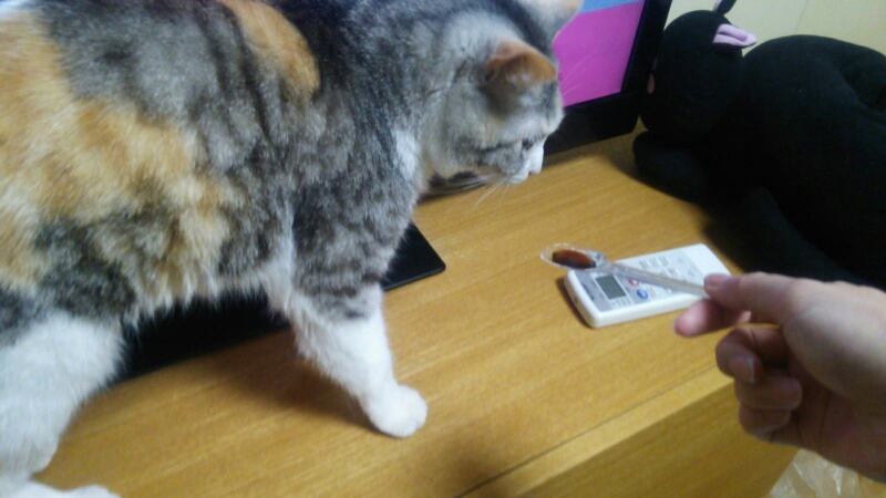 スプーンに入れてみましたが、全然舐めません。