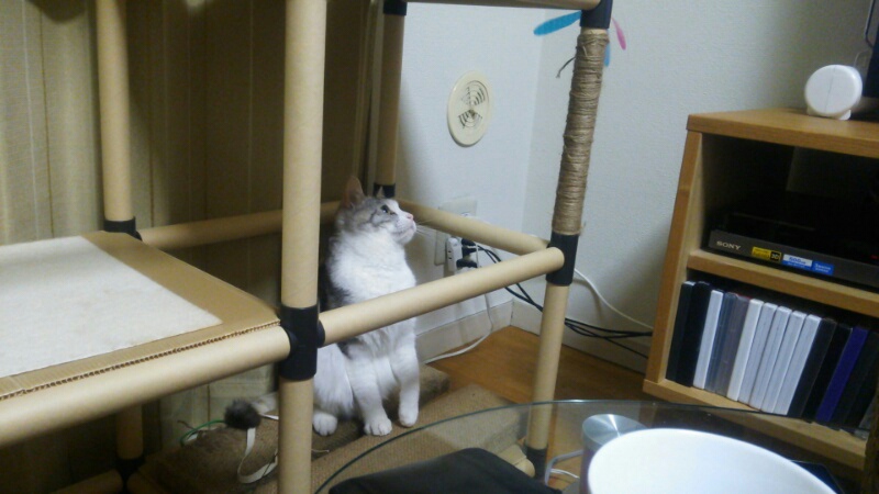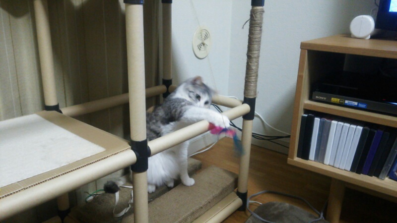キャットタワーからおもちゃを狙うしまみけ。