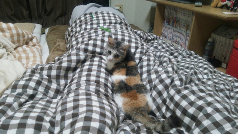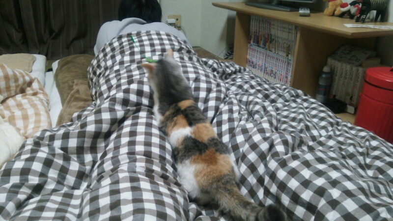 昨日のしまみけがいた布団の海は、正確には主人の足の間でした。