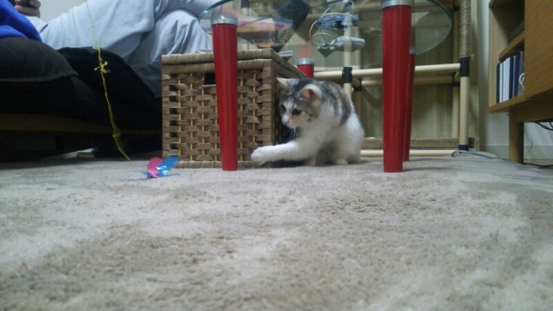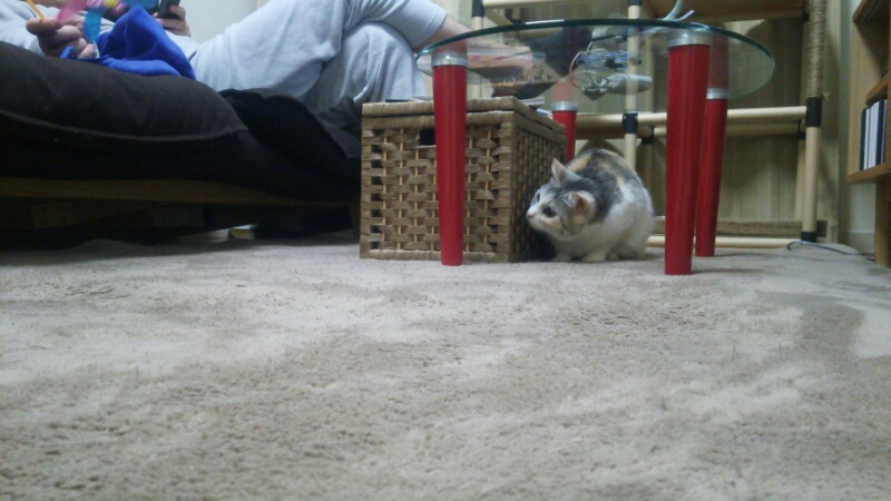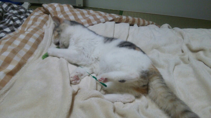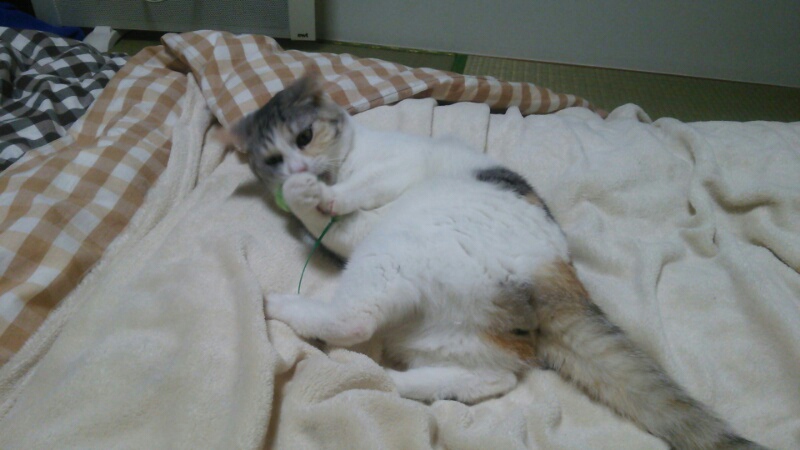いつもなら寝る前に寝室で遊んで、電気を消すとしまみけはご飯を食べて自分の毛布に行くっていうのがだいたいのお決まりなんですが、昨日は私の布団から動きませんでした。