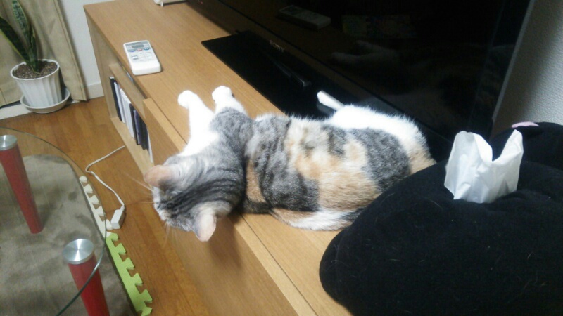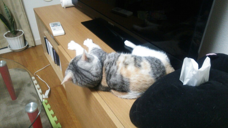 いつものテレビ台でくつろぐしまみけ。