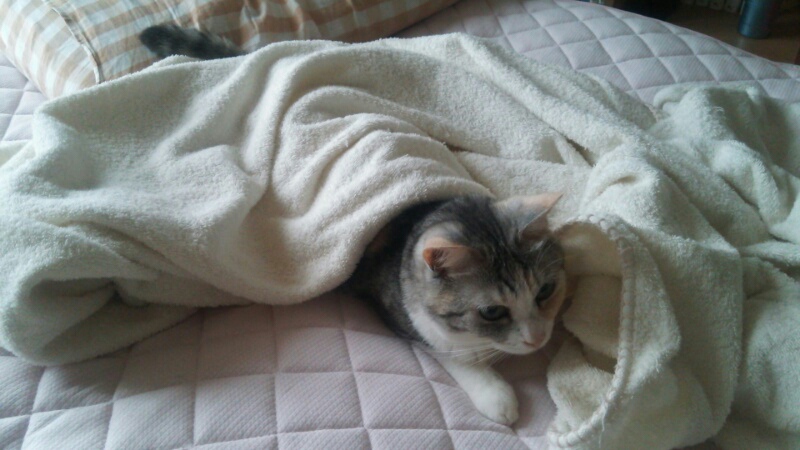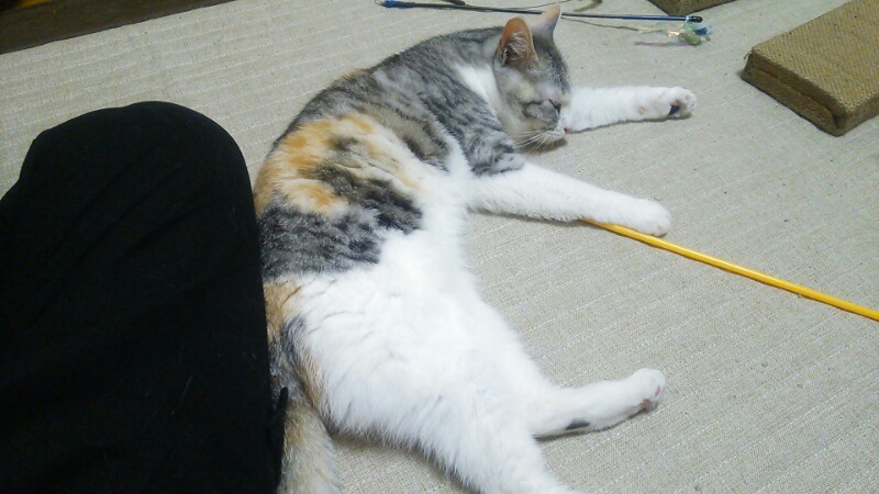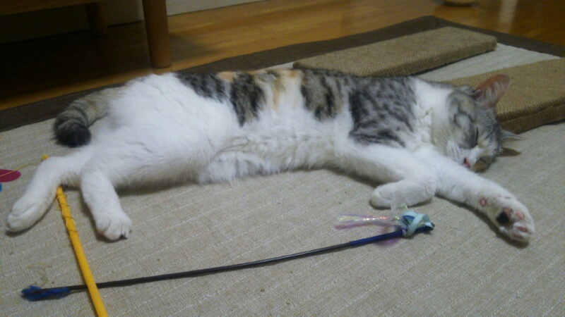 そして日曜の今朝は、また私に向かって爪を出してきたんですが、まだ寝る時間でしょ~、と背中をぽんぽん叩いたら、そのまま布団で一緒にぐっすりでした。